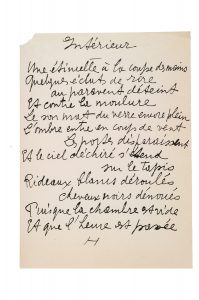 REVERDY PIERRE (1889-1960). Intérieur, poème autographe [1930], 1 page in-8 à l'encre. Poème publié dans Pierres blanches (1930) et repris dans Main d'uvre (1949).