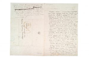 SAND GEORGE (1804-1876). Lettre autographe adressée à la cantatrice et compositrice Pauline VIARDOT. S.l., marque postale du 1er octobre 1843, 3 pages et demie in-8 sur un double feuillet. Encre noire sur papier au chiffre à froid «G.S.»....