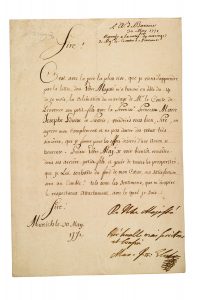 «C'est avec la joie la plus vive, que je viens d'apprendre par la lettre, dont Vôtre Majesté m'a honoré [...] la celebration du mariage de Mr le Comte de Provence son petit-fils avec la Serenisse Princesse Marie Josephe Louise de Savoie ; voudriés vous bien, Sire, en agréer mon compliment et ne pas douter des voeux très sincères, que je forme pour les effets désirés d'une union si heureuse».