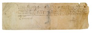 CHARLES VII (1403-1461) Roi de France. P.S. «Charles», Bourges 19 mai 1447 ; contresignée par DELAHERE ; vélin oblong in-4 (10 x 32 cm, deux petits trous, trace de collage au dos).