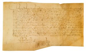 CHARLES D'ORLÉANS (1391-1465) Prince et poète, père de Louis XII. P.S. «Charles», Lyon 9 juin 1449 ; vélin oblong in-4 (16 x 26 cm, légères mouillures) ; transcription ancienne jointe.