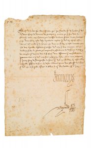FRANÇOIS IER (1494-1547) Roi de France. L.S. «Francoys», Blois 3 octobre 1519, à Pierre JEHANNOT, Sieur de LA LOUE ; contresignée par Gilbert BAYARD ; 1 page in-fol., adresse au verso (rousseurs et petite déchirure dans le haut sans...
