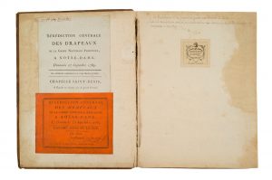 On a collé sur le contreplat deux billets d'entrée à la Bénédiction générale des Drapeaux de la Garde Nationale Parisienne, à Notre-Dame, le 27 septembre 1789, dont un signé par QUATREMÈRE DE QUINCY, l'un des trois représentants officiels de la Commune choisis pour organiser la cérémonie.