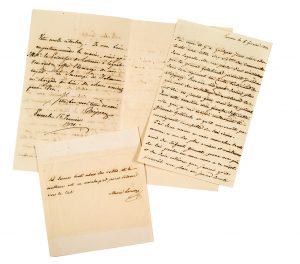 • une petite P.A.S. de MARIE-LOUISE, pensée découpée dans un album (1 p. in-12) : «Les larmes sont mères des vertus, et le malheur est un marchepied pour s'élever vers le ciel»;