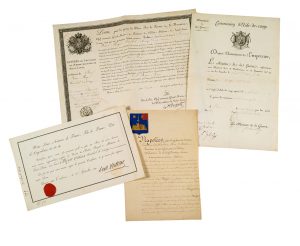Lettres de chevalier de l'ordre de Saint-Louis, signées LOUIS XVIII (secrétaire), 1814, et certificat signé par le Duc d'ANGOULÊME. Lettres de service signées SOULT, Duc de Dalmatie, 1814.