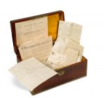 125 feuillets de formats divers ; dans un coffret de voyage ancien (42 x 20 x 28 cm) en acajou et éléments de laiton doré, intérieur en pin verni (avec son miroir).