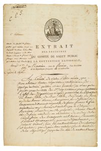 SAINT-JUST Louis-Antoine (1767-1794) conventionnel, membre du Comité de Salut public. P.S. «St Just», signée aussi par ses collègues Robert LINDET et Lazare CARNOT, 9 floréal II () ; 2 pages in-fol., vignette et en-tête du Comité de Salut...