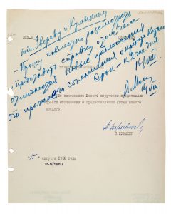Sur une proposition accordant des crédits supplémentaires à la Chine, signée par Pawel KUMYKIN (1901-1976), commissaire et ministre soviétique pour le commerce extérieur, Molokov répond favorablement..