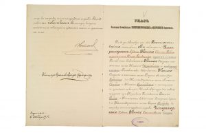NICOLAS II (1868-1918) le dernier Tsar de Russie. P.S. «Nicolas», Voronej 6 décembre 1914 ; contresignée par le Baron FREDERICK, Chancelier des ordres ; 4 pages in-fol. à en-tête imprimé, cachet encre ; en russe.