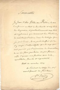 « Je jure d’être fidèle au Roi, de me conformer en tout à la Charte et aux lois du Royaume, et particulièrement aux lois et règlemens qui concernent les élections ; de maintenir l’ordre dans le Collège que je préside, de ne point souffrir qu’on s’y occupe d’autres objets que de ceux qui sont prescrits par l’ordonnance de convocation ; de ne rien faire par haine ou par faveur ; enfin d’exercer mes fonctions avec zèle, exactitude, fermeté et impartialité. »…