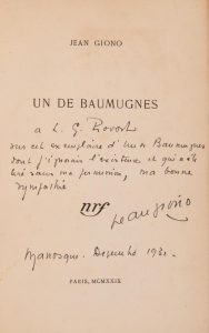 Dans une lettre du 5 août 1929 à Lucien Jacques, il lui annonce que Gide va porter les épreuves d’Un de Baumugnes à Bonn pour cette réunion de cinéastes. Giono connaissait donc l’existence de ce tirage, ce qui confirme notre hypothèse.