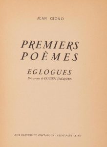 [JACQUES (Lucien)]. GIONO (Jean). Premières Proses et Premiers Poèmes. Saint-Paul, Éditions Aux Cahiers du Contadour, 1938. In-8, broché.