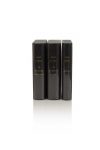 Reliures maroquin noir à encadrements, plats de box rouge aux reflets nacrés avec le nom de l’auteur, titres mosaïqués en lettres dorées et dates en chiffres romains, encadrements d’un filet doré, dos lisses, doublures et gardes de papier gris bleu, tranches dorées sur témoins, couvertures et dos conservés.