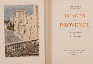 [SAMSON (Charles)]. GIONO (Jean). Images de Provence. Paris, Éditions les Heures Claires, sans date [1961]. Illustré de 12 pointes sèches de Charles Samson. In-4, broché, en feuilles, couverture rempliée, chemise et étui d’éditeur.