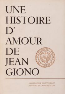 GIONO (Jean). Une histoire d’amour. Les Éditions de Manosque, Rico imprimeur, 1969. In-8, reliure cartonnée avec jaquette.