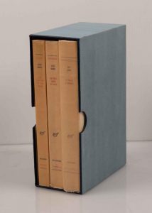 Étui papier uni bleu gris bordé cuir, contenant les 3 livres.