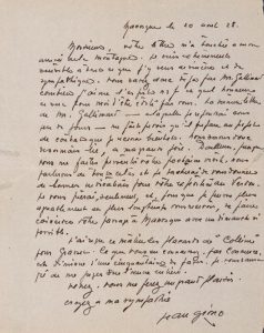 Lettre qui montre le désir de Giono d’être édité par Gallimard et laisse présager le double contrat avec Grasset et Gallimard, qui amènera Giono au bord d’un procès.
