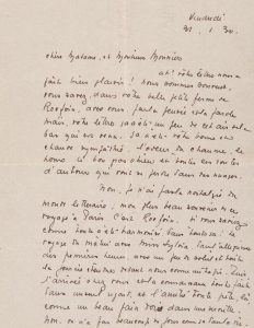 […] Ah ! Votre lettre nous a fait bien plaisir ! Nous sommes souvent, vous savez, dans votre petite ferme de Rocfoin, avec vous par la pensée et la parole mais, votre lettre ça a été un peu de cet air de la bas qui est venu. Ça a été votre bonne et chaude sympathie, l’odeur de chaume de houx et de bon gros chien et toutes ces routes d’autour qui vont se perdre dans des nuages. Non, je n’ai pas la nostalgie du monde littéraire ; mon plus beau souvenir de ce voyage à Paris, c’est Rocfoin .Si vous saviez comme tout a été harmonisé, dans tout ça ! Le voyage du matin avec Miss Sylvia (amie d’Adrienne Monnier), dans l’allégresse des premières heures, avec un peu de soleil et toute la journée étendue devant nous comme un tapis. Puis l’arrivée chez vous, et la connaissance toute faite dans un seul regard, et l’amitié toute préte, là, comme un beau pain doré dans une serviette. Non on n’a pas beaucoup de jours comme ça dans la vie .Nous avons l’espoir de revoir Mademoiselle Adrienne et Miss Sylvia cet été à Manosque ; que ne pouvez vous venir ! Mais si je retourne à Paris, croyez qu’au fond du cœur, le grand désir de Rocfoin sera. […]