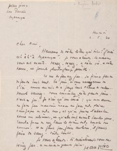 […] Heureux de votre lettre qui dit : « j’irai cet été à Manosque ». Je vous attends la maison vous est ouverte. Venez, venez, à votre gré, à votre heure, et pour le plus longtemps possible. Ne me défendez pas, ça finira par se défendre tout seul. (affaire du double contrat) Et puis si vous saviez comme vu d’ici, comme au sein de ce pays tout change de valeur… Vous le saurez, vous connaitrez cette pauvre paix. N’est ce pas. Je n’ai qu’un souci que mon oeuvre ne fasse pas mauvais visage en face de la pleine campagne ou de la mer, et qu’on puisse l’absorber comme un aliment, et qu’elle soit ensuite dans les yeux, dans la forme du nez, dans le dessin de la bouche des hommes. Il ne faut pas faire des livres, il faut faire du sang. Voila tout.