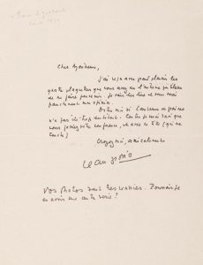 GIONO (Jean) L.A.S. à Pierre Aguetant (Poète, romancier ensuite il se consacrera au théâtre.) 1 page in-4 à l’encre noire sur papier filigrané (Navarre) ; c. 1932.