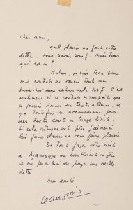 Quel plaisir me fait votre lettre. Vous savoir sauf. Mais dans quoi est on ? […] Il est tenu par ses contrats aux éditions de la NRFet ne peux donner de textes ailleurs […] Il y a toutefois un accommodement pour des textes courts à tirage limité. Si cela intéresse votre père j’aimerai lui faire plaisir et vous faire plaisir. De toute façon votre visite à Manosque me comblerait de joie et me permettrai de payer une vieille dette[…]