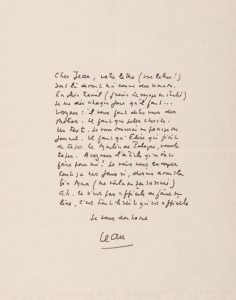 Votre lettre (vos lettres!) sont là devant moi comme des remords. En plein travail (j’écris le Voyage en Italie). Je me dis chaque jour qu’il faut…Voyons : il vous faut dites vous des photos. Il faut que je les cherche. Un texte .Je vous donnerai un passage du journal. Il faut qu’Elise qui finit de taper Le Moulin de Pologne, vous le tape. Avez-vous l’article qu’on doit faire pour moi ? […] Ah, ce n’est pas difficile de faire un livre, c’est tout le reste qui est difficile. […]