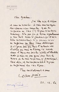 GIONO (Jean). L.A.S. à Isis Kischka (éditeur de Routes et Cheminspour l’exposition des Peintres témoins de leurs temps, au musée Galliera). 1 page in-8 à l’encre noire sur papier à son en-tête.