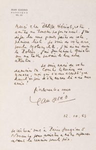 GIONO (Jean). L.A.S. à Philippe Hériat(romancier, membre de l’Académie Goncourt). 1 page in-8 à l’encre noire sur papier à son en-tête.
