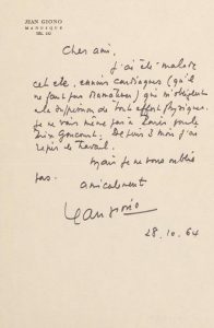 GIONO (Jean). L.A.S. à un ami. 1 page in-8 à l’encre noire sur papier à son en-tête.