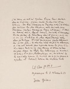 GIONO (Jean). Manuscrit autographe signé concernant Eugène Curet, écrivain et ancien avocat de Giono. 1 page in-4 à l’encre noire sur papier jaune filigrané (Bambou-Nippon).