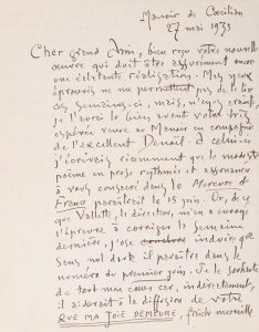 Cher grand ami, bien reçu votre nouvelle œuvre (Que ma joie demeure) qui doit être assurément encore une éclatante réalisation. Mes yeux éprouvés ne me permettent pas de lire ces semaines ci, mais, n’ayez crainte, je l’aurai lu bien avant votre très espérée venue au manoir en compagnie de l’excellent Denoël […] Il a écrit un poème en prose consacré à Giono et sur dans le Mercure de France de juin. Il souhaite que son article aide à la diffusion de son roman Que ma joie demeure […] fraîche merveille de votre Esprit à la fois humain et panique.