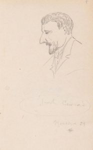 Jean GIONO (attribué à) Portrait de Joseph Conrad. Dessin au crayon noir sur feuille de carnet, situé et daté Manosque 29. Annoté dessin de Jean Giono à l’encre noire (au verso). 17,50 x 11 cm.