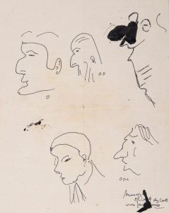 Jean GIONO (attribué à). Caricatures de clients du Comptoir National d’Escompte de Paris.* Cinq dessins à l’encre noire de profils de clients de la banque au dos d’un formulaire de souscription pour des bons du trésor du Comptoir National...