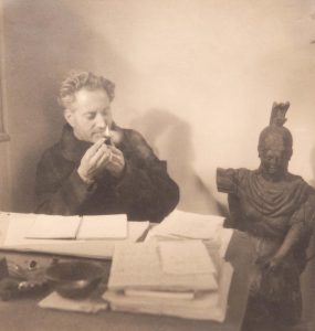 Gaston KARQUEL (1906-1971). Giono à sa table de travail allumant sa pipe. c.1942. Tirage argentique d’époque. Belle épreuve d’agrandissement. image : 24,5 x 23,5 cm feuille: 30 x 24 cm.
