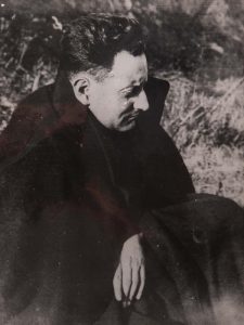 Albert HARLINGUE (1879-1964). Giono assis de profil ,vêtu d’une cape. c.1950. Tirage argentique d’époque, cachet de la collection Roger-Viollet et annotations au verso. 24 cm x 18 cm. Époque très difficile pour Giono. Les Âmes Fortes (1949).