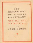 GERULL-KARDAS. Six photographies de Kardas illustrant Que Ma Joie Demeure de Jean Giono. c.1936. Petit port-folio (12,5 cm x 9 cm), premier plat avec titre imprimé au recto, légendes des photographies et justification au verso. Tirage limité à 20...