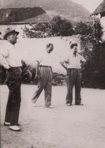 GIONO, GIDE, JEAN DENOËL jouant aux boules à Lalley. c.1935. Tirage argentique postérieur. 18 x 12,5 cm.