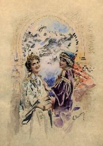 Un des 20 premiers exemplaires sur japon impérial numérotés par l'éditeur, contenant 4 états des gravures, dont l'eau-forte pure et une suite coloriée par l'illustrateur ainsi qu'une belle aquarelle originale inédite (15 x 10 cm) en couleurs et à pleine page signée G. Vuillier, montrant Deux jeunes Mauresques vêtues d'habits aux couleurs éclatantes, conversant dans un patio.