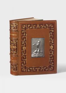 Puech représentant la Muse de Chénier, dos mosaïqué et doré de même, tranches dorées, encadrement intérieur orné d’un large listel de maroquin grenat serti à l’or, motifs dorés aux angles, doublure et gardes de soie irisée, doubles gardes, couverture, chemise et étui (Ch. Meunier, 1906).