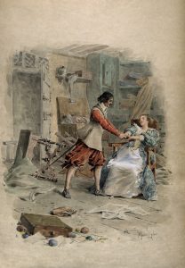 • une belle aquarelle originale pleine page signée (21 x 18 cm) de Maurice Leloir, représentant Dans un appartement en grand désordre la charmante Madame Bonacieux assise serrant en souriant les mains de d'Artagnan, son libérateur (tome I, p. 147).