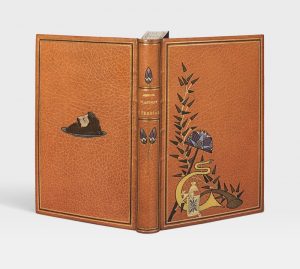 casque, un glaive et un bouclier dorés, second plat orné de la tête de Iaokanann de maroquin mosaïqué, dos lisse orné de trois fleurs de maroquin mosaïqué, tranches dorées sur témoins, listel de maroquin sable et filet au pointillé doré intérieurs, fleurons mosaïqués aux angles, doublure de maroquin grenat, gardes de soie grenat, couverture et dos, chemise demi-maroquin orange avec coins et étui (Ch. Meunier 1903).