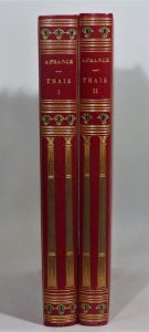 FRANCE (Anatole). Thaïs. Paris, Collection des dix, 1900. 2 volumes in-4, bradel demi-maroquin rouge avec coins, dos lisse orné de colonnes et fleurs de lotus mosaïquées, couverture et dos, non rogné (Carayon).