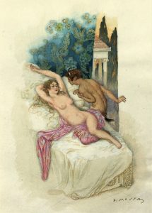 ♦ Un des 30 premiers exemplaires sur japon, justifié par l'éditeur et comportant une aquarelle inédite (18 x 12 cm) signée de l’artiste, représentant La "Belle" dévêtue endormie sur son lit semble rêver, un jeune faune s’approche...