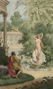 ─ On a relié en tête une très belle aquarelle originale signée de Paul Avril (Le roi contemplant Nissia, 20 x 12 cm, variante de l’illustration des pp. 27 et 40) et in fine, le spécimen de souscription illustré.