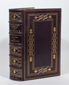 MÉRIMÉE (Prosper). Chronique du règne de Charles IX. Paris, Les Amis des Livres, 1876. Deux tomes en un volume in-8, maroquin aubergine, important décor doré et à froid de style Renaissance, dos orné de même, tranches dorées, filets...