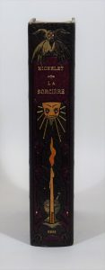 MICHELET (Jules). La Sorcière. Paris, J. Chevrel, 1911. In-8, demi-maroquin noir avec coins, dos lisse orné en long d'un décor mosaïqué de maroquin gris, rouge, jaune, crème et violet figurant un démon à la chandelle, tête dorée, couverture...