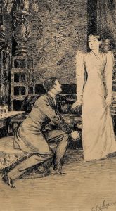 ROCHEGROSSE (Georges). La Supplication amoureuse. Dessin original à la plume signé G. Rochegrosse (22 x 13 cm), sous verre. Dans un riche salon au décor japonisant, un élégant jeune homme implore une belle jeune femme.