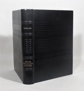 RONSARD (Pierre de). Discours des misères de ce temps. Paris, Le Fuseau Chargé de Laine, 1930. In-4, maroquin noir orné sur les plats d’une succession régulière de filets horizontaux poussés à froid et de listels bombés mosaïqués en même...