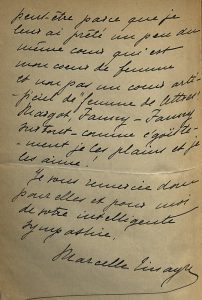 « Monsieur, Si je ne revenais d'un long voyage en des pays où il m'était impossible de recevoir exactement lettres et journaux, serais-je excusable de vous remercier si tard de votre charmant article. Il est si joli que je me demande si ce n'est pas vous qui êtes mon obligé, puisque je vous donne l'occasion de l'écrire. Voilà jusqu'où va ma vanité. [...] La Maison du Péché m'a coûté trois ans de travail et ce n'est pas vrai qu'en art le temps ne fasse rien à l'affaire. Ce qui m'a fait tant de plaisir dans votre article c'est que vous avez très bien compris le caractère de ce conte bleu où la vérité historique [...] se mêle à la fantaisie [...] ».