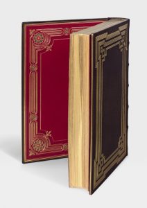 rouge décorée d’un large encadrement de filets et pointillés dorés et à froid, agrémenté de fleurons dorés et quadrilobes, de rosaces et trilobés aux angles, dorés et mosaïqués dans les tons vert et ocre, gardes de soie rouge, doubles gardes, couverture, étui (Mercier Sr de Cuzin).